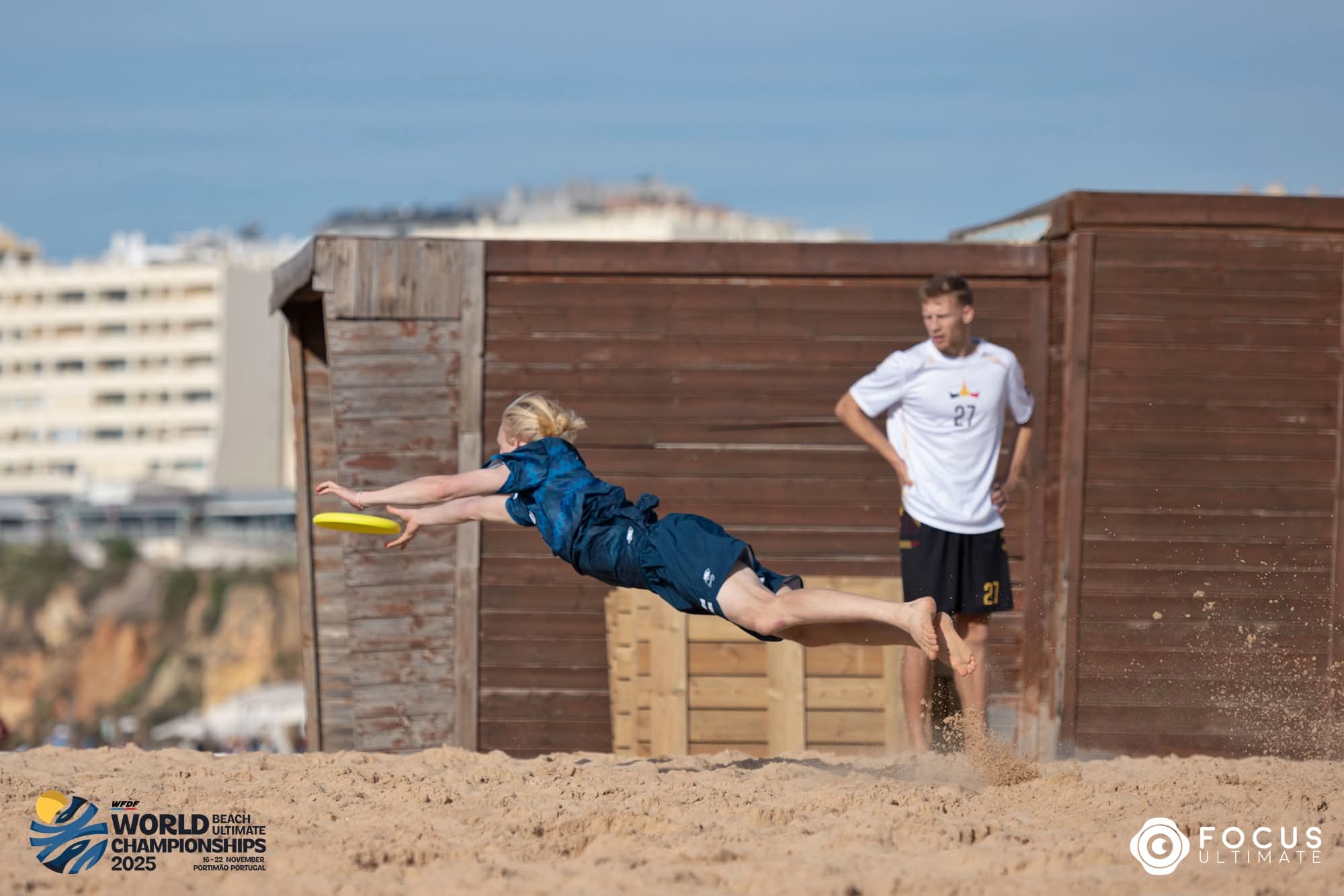 Avoimen maajoukkueen Oskar Kunnas lentää kiekkoon. Kuva: Fokus Ultimate